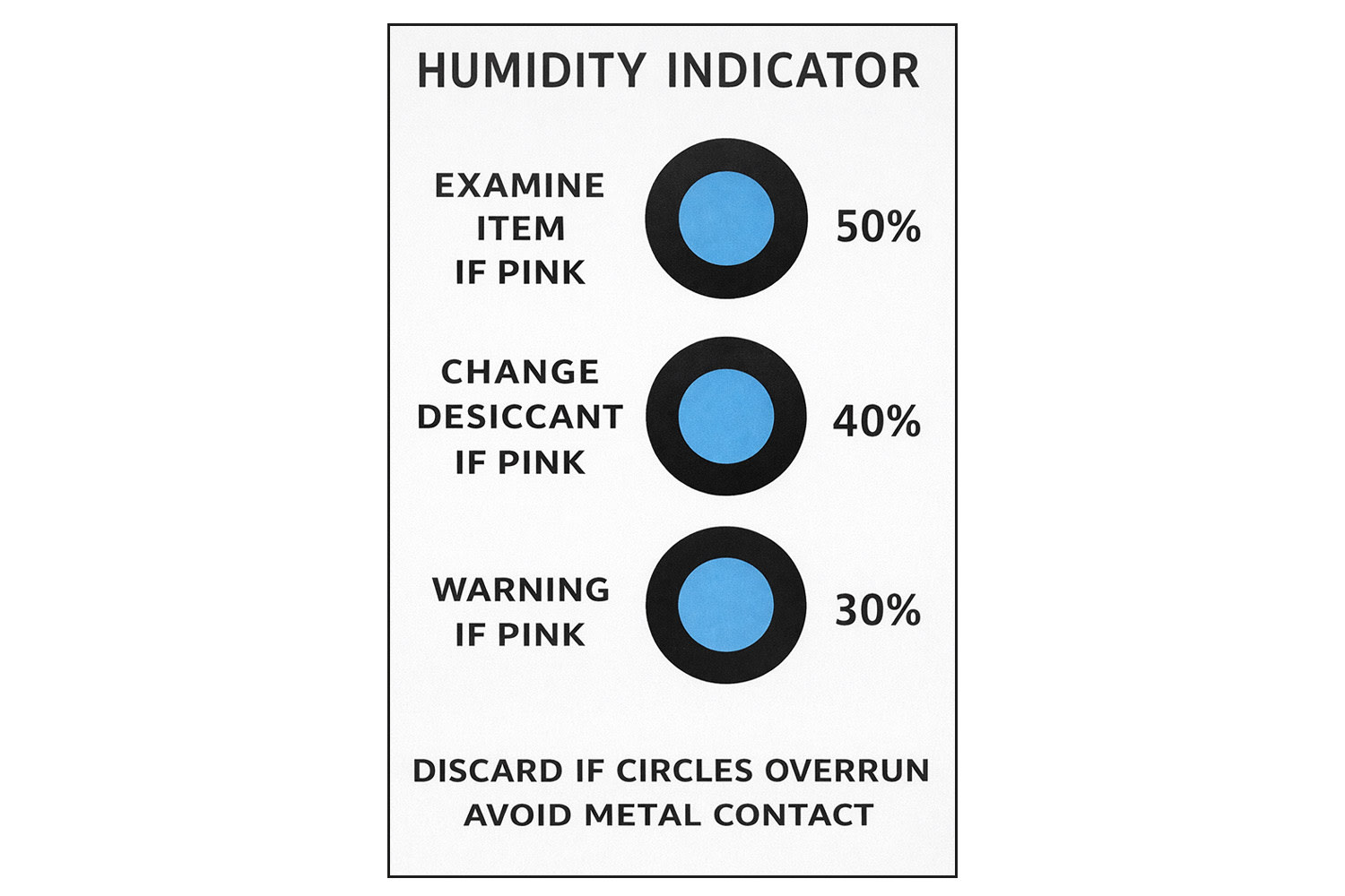 - Zeigt in Verbindung mit Trockenmitteln durch Verfärbung den Feuchtegrad (relative Feuchte) in der Verpackung an