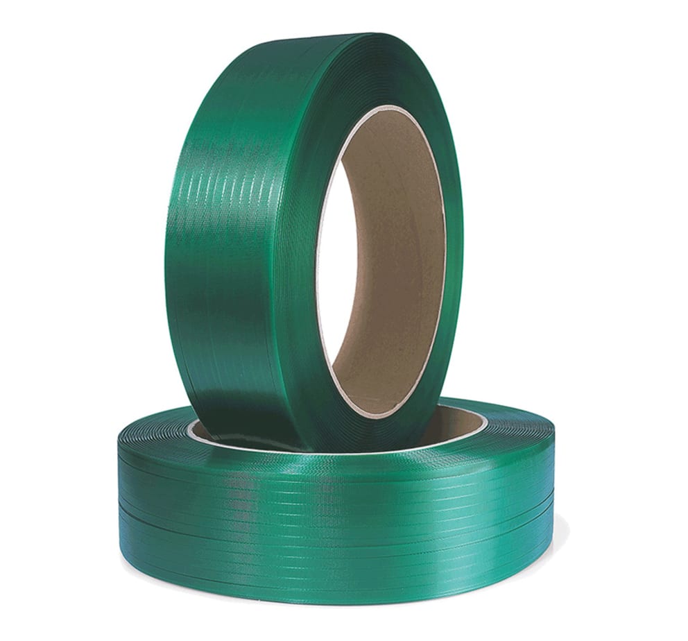 Umreifungsband aus recyceltem Polyester-/Polyethylenterephthalat (PET) ist sehr widerstandsfähig und kann für fast alle schweren Palettenladungen verwendet werden. PET-Umreifungsband ist häufig eine Alternative zu Stahl-Umreifungsband.